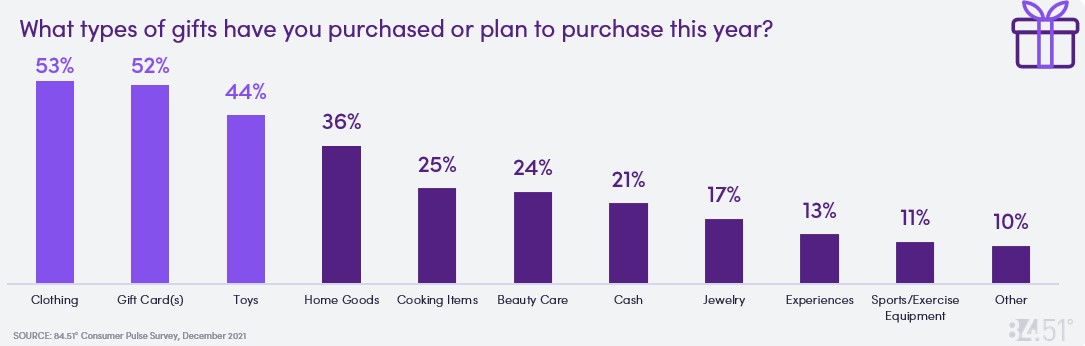 As customers fill their shopping carts this holiday season, the top three types of gifts they will be searching for include clothing, gift cards, and toys.